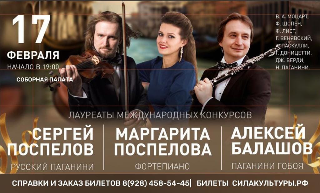 17 февраля лауреаты международных конкурсов Сергей Поспелов (скрипка), Алексей Балашов (гобой) и Маргарита Поспелова (фортепиано) окунут своих гостей в невероятный мир карнавальной Венеции. В программе – шедевры В. А. Моцарта, Ф. Шопена, Ф. Листа, Г. Венявского, А. Паскулли, Г. Доницетти, Дж. Верди, Н. Паганини, отмеченные яркостью, виртуозностью и эмоциональностью.