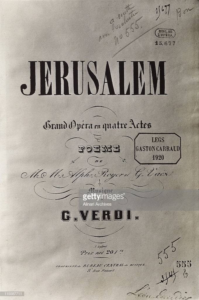 Опера «Иерусалим» была создана Верди специально для театра Grand Opera в Париже. Для французской сцены композитор переработал написанную им раннее оперу «Ломбардцы в первом крестовом походе», создав шедевр в новом для себя направлении «большой оперы».