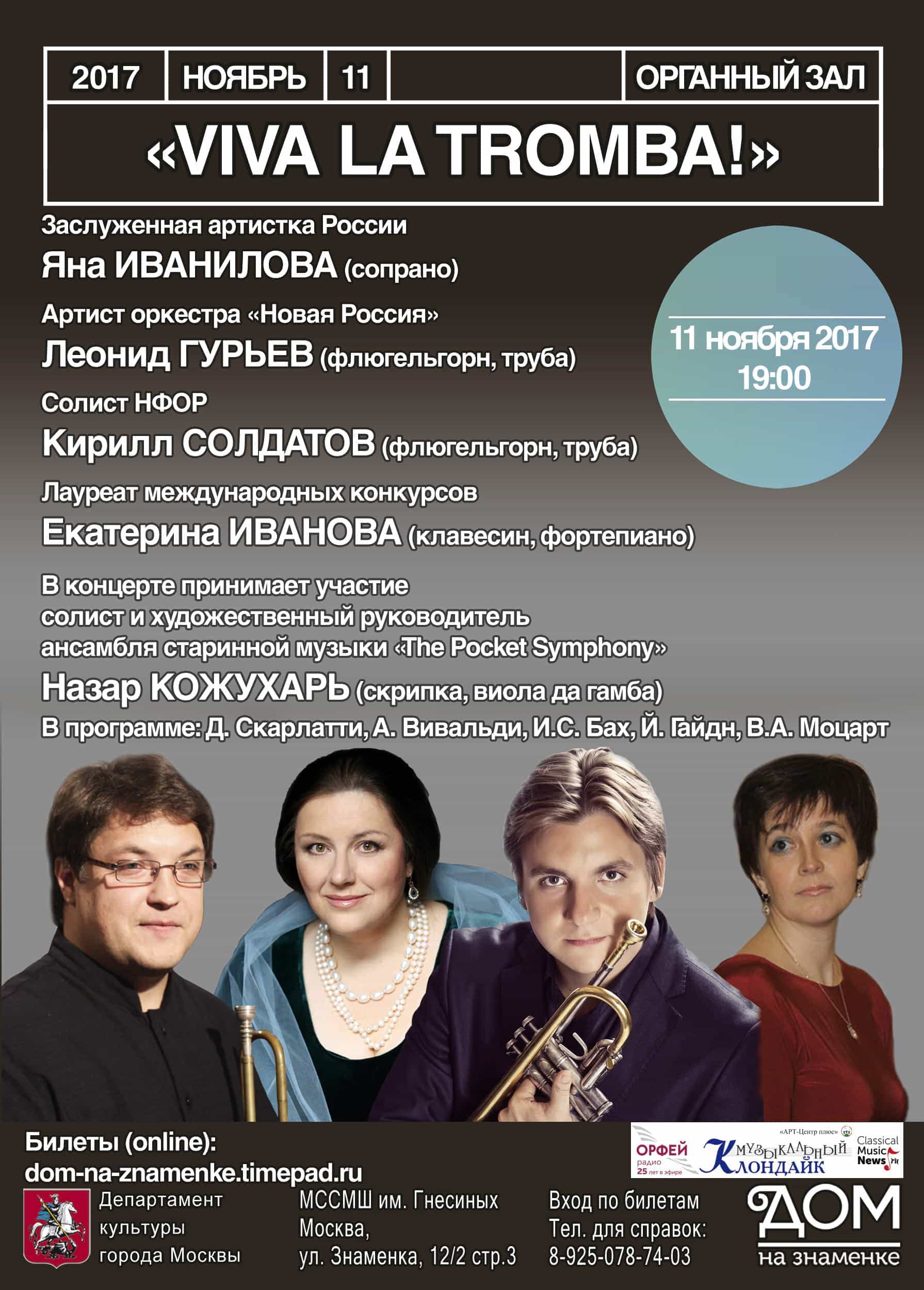 В концерте «Viva la Tromba!» Яна Иванилова исполнит несколько арий и кантату Алессандро Мелани, написанных специально для сопрано и трубы (кантата А. Мелани «Quai bellici accenti ascolti mio core?» является одной из жемчужин вокально-инструментальной музыки конца XVII века для такого редкого состава исполнителей, как сопрано, трубы и бассо континуо).