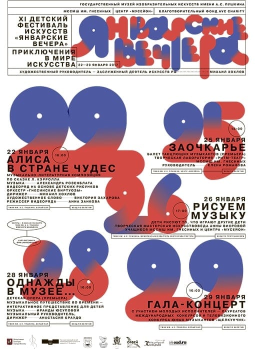 С 22 по 29 января 2017 года в Москве пройдет XI Детский фестиваль искусств «Январские вечера» – совместный проект МССМШ им. Гнесиных и ГМИИ им. А. С. Пушкина.