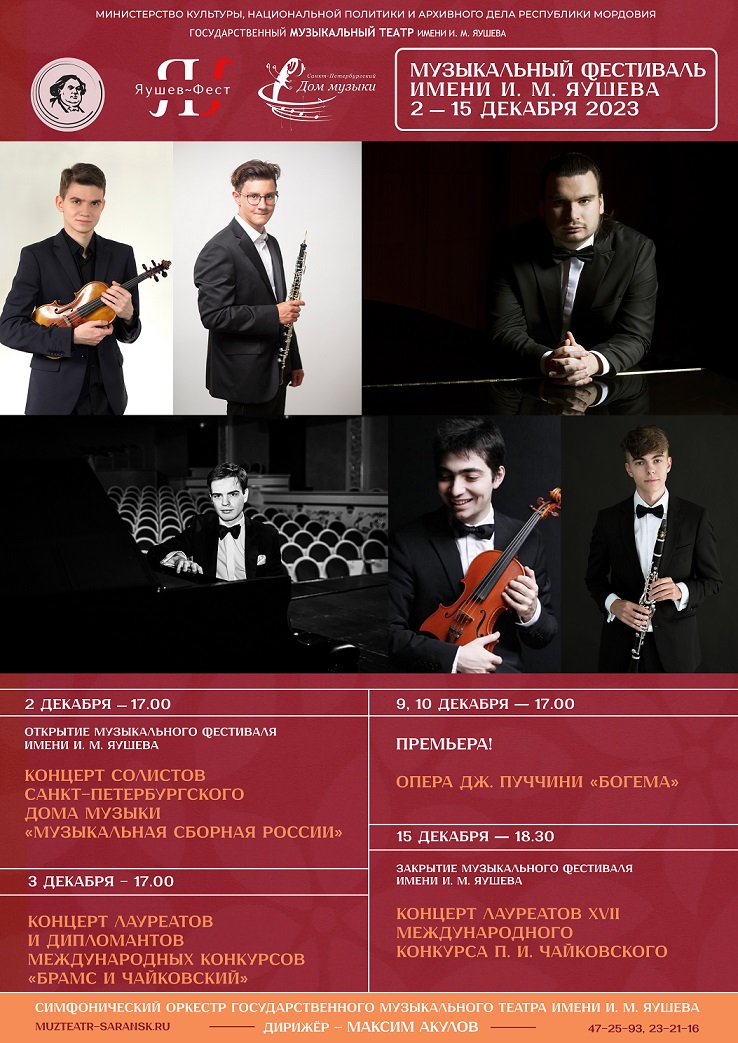 В рамках Фестиваля, который пройдет с 2 по 15 декабря 2023, на сцене Государственного музыкального театра им. И. М. Яушева состоятся концерты симфонической музыки, а также будет представлена новая постановка оперы Джакомо Пуччини «Богема».