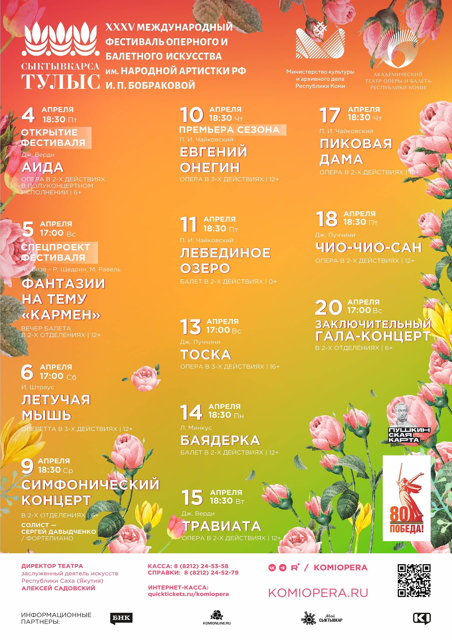 Стартует фестиваль 4 апреля премьерой театрального сезона — оперой Дж. Верди «Аида» и завершится 20 апреля Заключительным гала-концертом. В афише фестиваля 12 ярких событий: премьеры, концертные программы, яркие постановки.