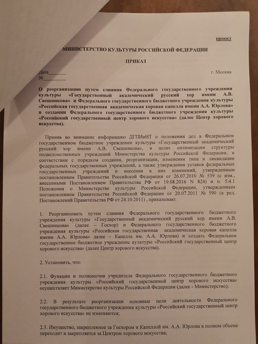 С другой стороны, в недрах ведомства подготовлен проект приказа, в котором говорится, что оба певческих коллектива станут частью нового художественного образования — Российского центра хорового искусства.
