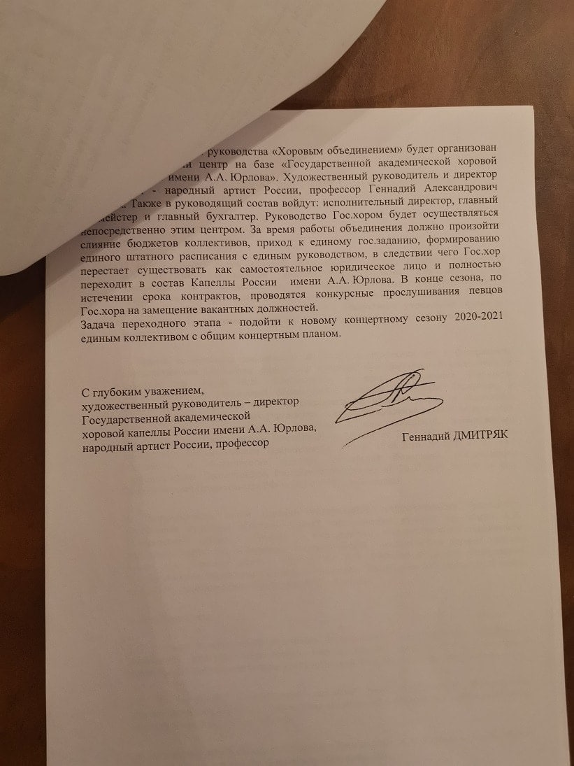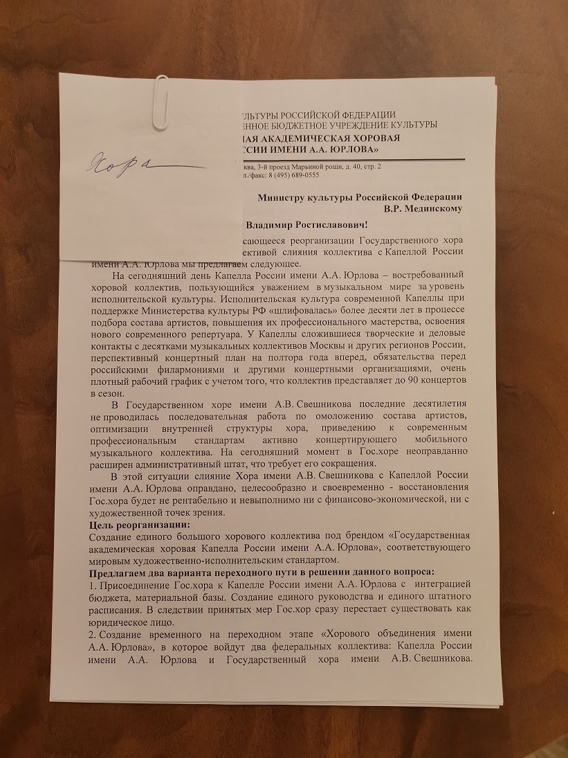 В то же время в недрах министерства, ещё возглавляемого Владимиром Мединским, полных ходом шла проработка вариантов объединения. Так, NEWS.ru ознакомился с содержанием письма на имя экс-министра, подписанного Геннадием Дмитряком. В нём, в частности, слияние хора Свешникова с капеллой Юрлова называется «оправданным, целесообразным и своевременным», так как «восстановление Госхора будет нерентабельно и невыполнимо ни с финансово-экономической, ни с художественной точек зрения».