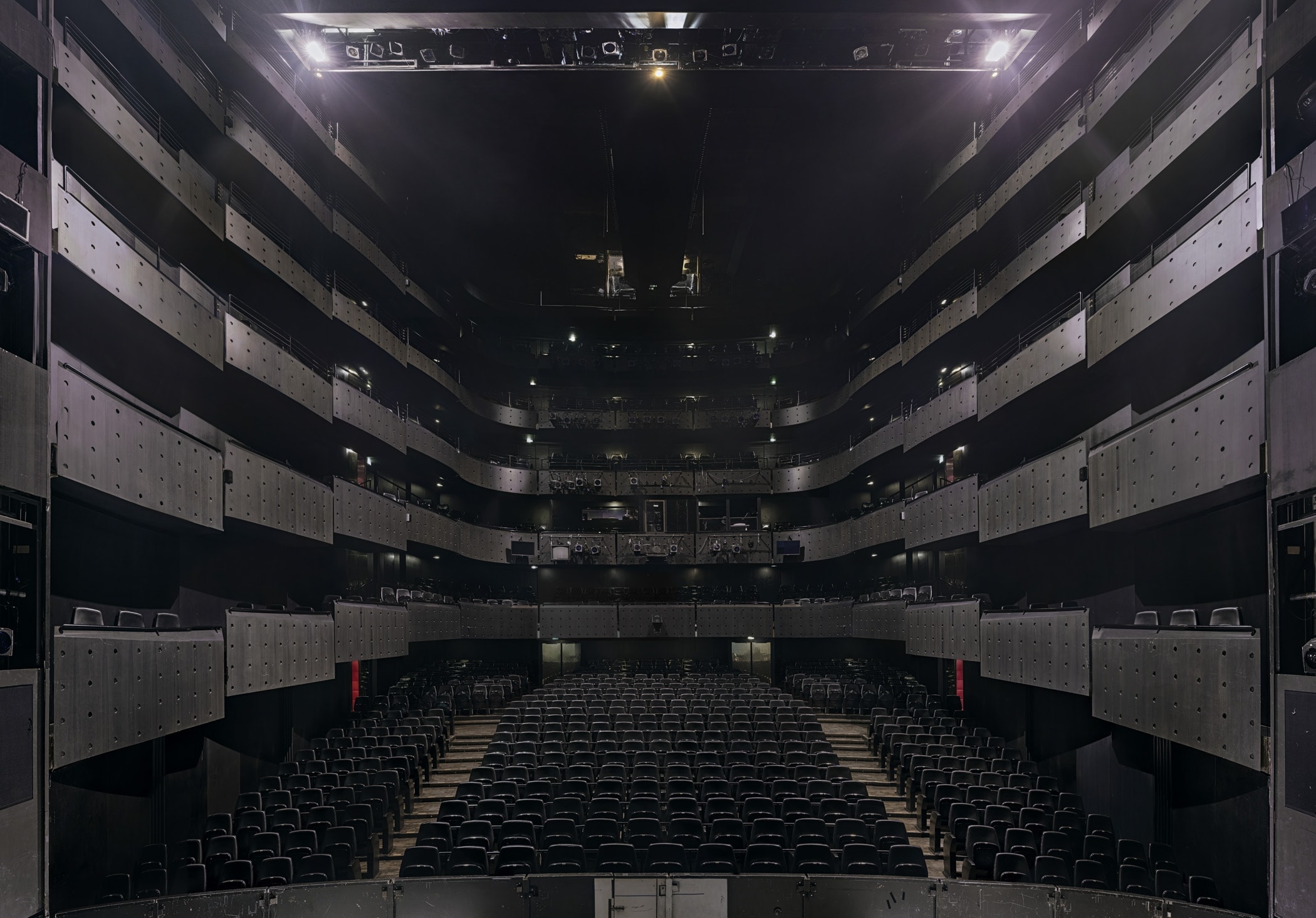 Да, и всё — чёрного цвета. Всё вообще. И стены, и пол, и потолок. И весь многоярусный зрительный зал — чёрный. Кресла обиты чёрной кожей и довольно жесткие. Те, кто привык в театральных креслах утопать, могут взять в гардеробе специальные подушечки, тоже чёрные. Даже унитазы в сортире — и те чёрные. Весь обслуживающий персонал — в чёрных футболках с номерами, как у футболистов, и с именами оперных композиторов.