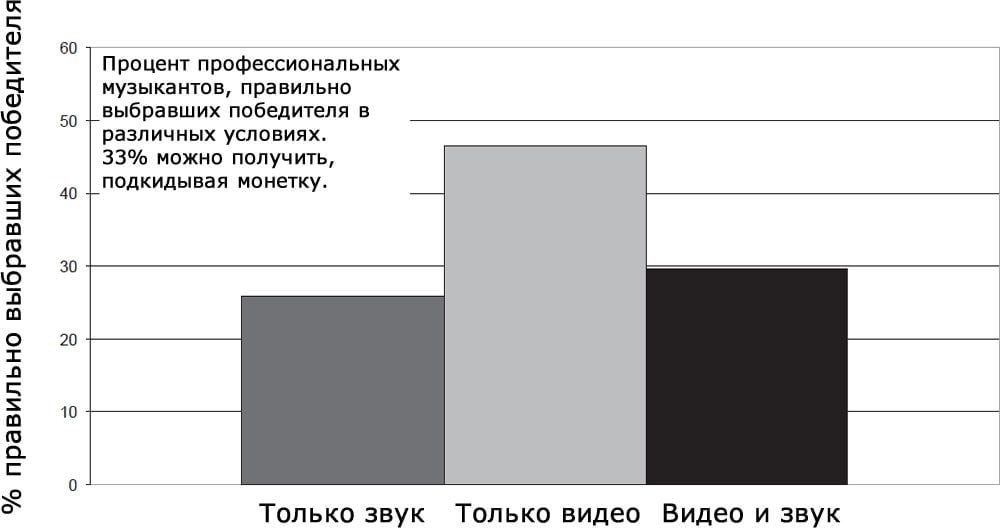 Но только 20,5% смогли правильно угадать победителя в условиях только звука. А в условиях беззвучного видео — 46,6%.