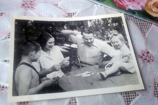 Есть в альбоме и другие семейные фотографии, где действие явно происходит на даче. Совсем маленькая Маша Лемешева в легком платьице сидит на деревянном столе, ее знаменитые родители и какой-то мальчик играют в карты, Сергей Лемешев весело замахивается, приготовившись сделать ход, супруга смеется…