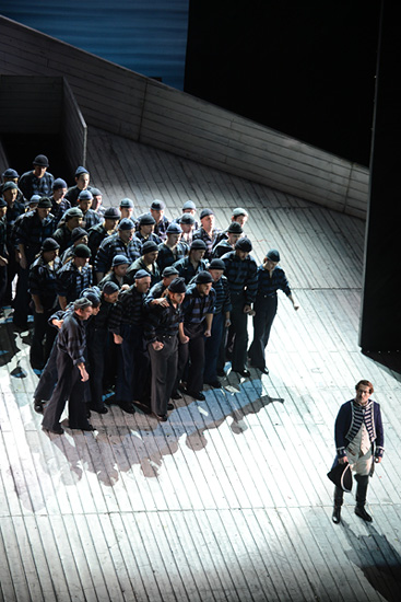 Безусловно, отношение двух главных героев, капитана Вира и Джона Клэггерта, к Билли Бадду вполне сподручно описывать в психоаналитических терминах. Во время спектакля я ловил себя на мысли, что эта морская история — почти «Керель из Бреста», история о мощном брожении страстей внутри замкнутого мужского сообщества. Но, повторюсь, если композитор и либреттист предпочли оставить это «сообщение» нерасшифрованным, режиссер не обязан его разжевывать.