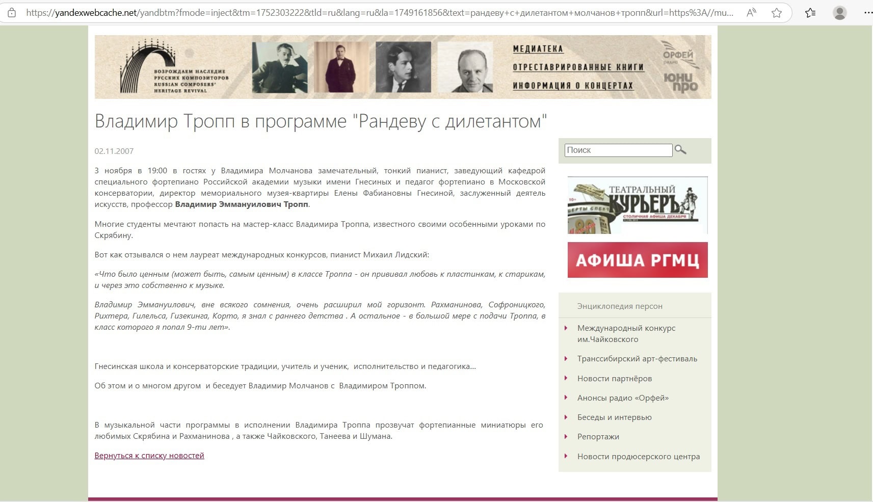 [5] Владимир Тропп. Я всегда чувствовал себя членом большой гнесинской музыкальной семьи // Хитрук А. Одиннадцать взглядов на фортепианное искусство. М. 2007. С. 276. Переиздано: М. 2015.