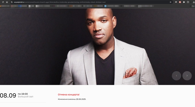 Американский тенор Лоуренс Браунли отменил своё выступление в зале «Зарядье», которым должен был открыться восьмой концертный сезон зала.