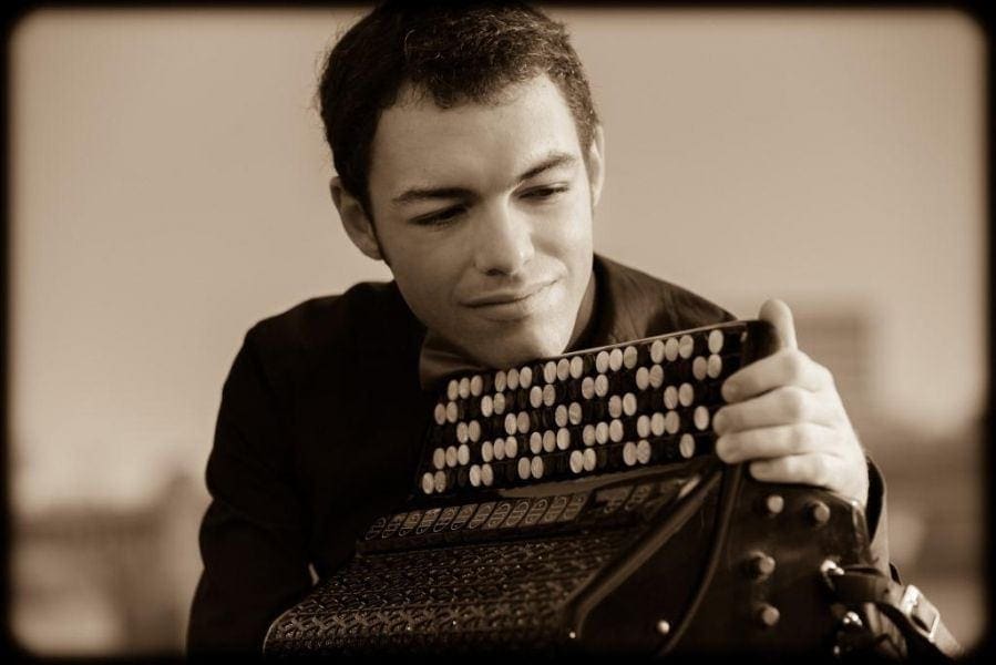 Один из самых ярких молодых баянистов выступил в тандеме с ударником Ростиславом Шараевским. Этот номер музыканты представили как «дуэль» инструменталистов.