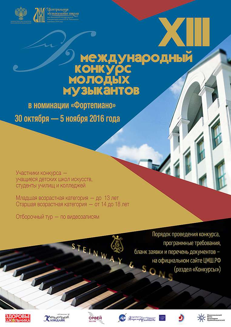 С 30 октября по 5 ноября 2016 года в Центральной музыкальной школе при Московской государственной консерватории проводится XIII Международный конкурс молодых музыкантов в номинации «Фортепиано».