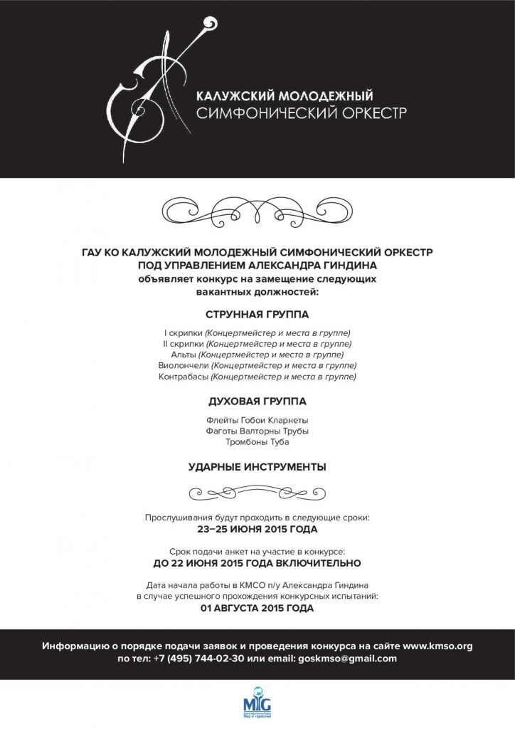Калужский молодежный симфонический оркестр объявляет конкурс на замещение следующих вакантных должностей: