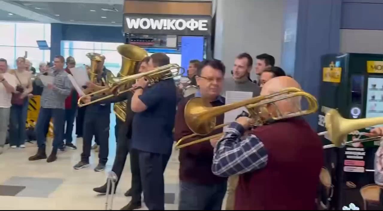 Артисты Кремлёвского оркестра Управления делами Президента России устроили импровизированный концерт в аэропорту Домодедово по просьбе участников специальной военной операции.