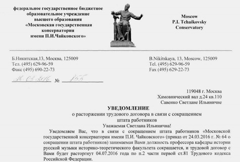 В уведомлении говорится, что трудовой договор со Светланой Савенко будет расторгнут 4 июля 2016 года в связи с тем, что «должность профессора кафедры истории русской музыки историко-теоретического факультета сокращается».