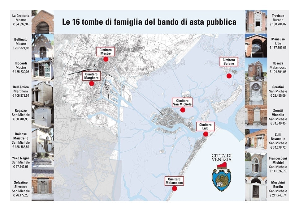 «Среди других мест погребения выделяется могила на кладбище Маламокко, расположенном на острове Лидо. До недавнего времени там покоились останки бывшего мэра этого городка, позднее вошедшего в состав Венеции. Он скончался в 1910 году, и его родственники сообщили, что не могут заниматься могилой и не будут продлевать концессионное соглашение»,