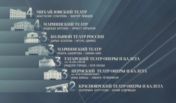 Семь дуэтов из шести ведущих театров страны: Дарья Хохлова и Игорь Цвирко (Большой театр), Коя Окава и Мидори Тэрада (Татарский театр оперы и балета), Юрий Кудрявцев и Екатерина Булгутова (Красноярский театр оперы и балета), Надежда Батоева и Эрнест Латыпов (Мариинский театр), Кимин Ким и Рената Шакирова (Мариинский театр), Анастасия Соболева и Виктор Лебедев (Михайловский театр), Инна Билаш и Никита Четвериков (Пермский театр оперы и балета) — представили хореографию разных эпох и направлений по своему выбору.