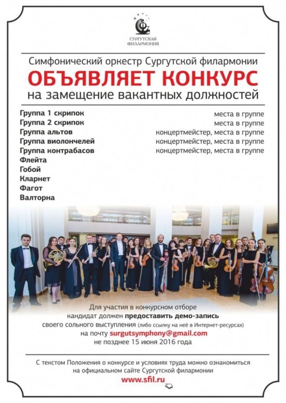В Симфоническом оркестре Сургутской филармонии — набор музыкантов: пресс-служба сообщает, что в коллективе есть несколько вакантных мест — нужны первые скрипки, альты, виолончели, контрабасы, флейта, гобой, валторна и другие.