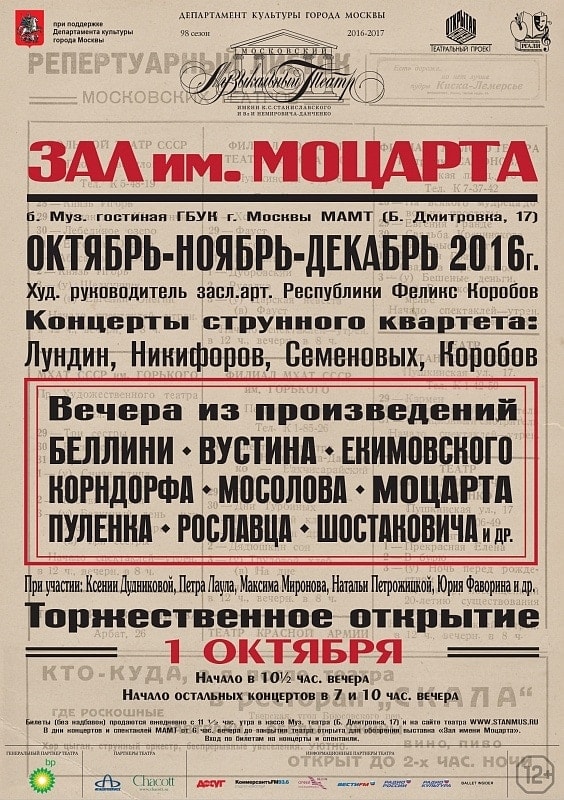Прошлой осенью сотрудники театрального музея обнаружили афиши того сезона и теперь театр отмечает 90-летие со дня открытия Моцартовского зала, который появился почти сразу с переездом в это здание Оперной студии Станиславского и Музыкальной студии Немировича-Данченко. Зал был связан со студиями организационно и творчески.
