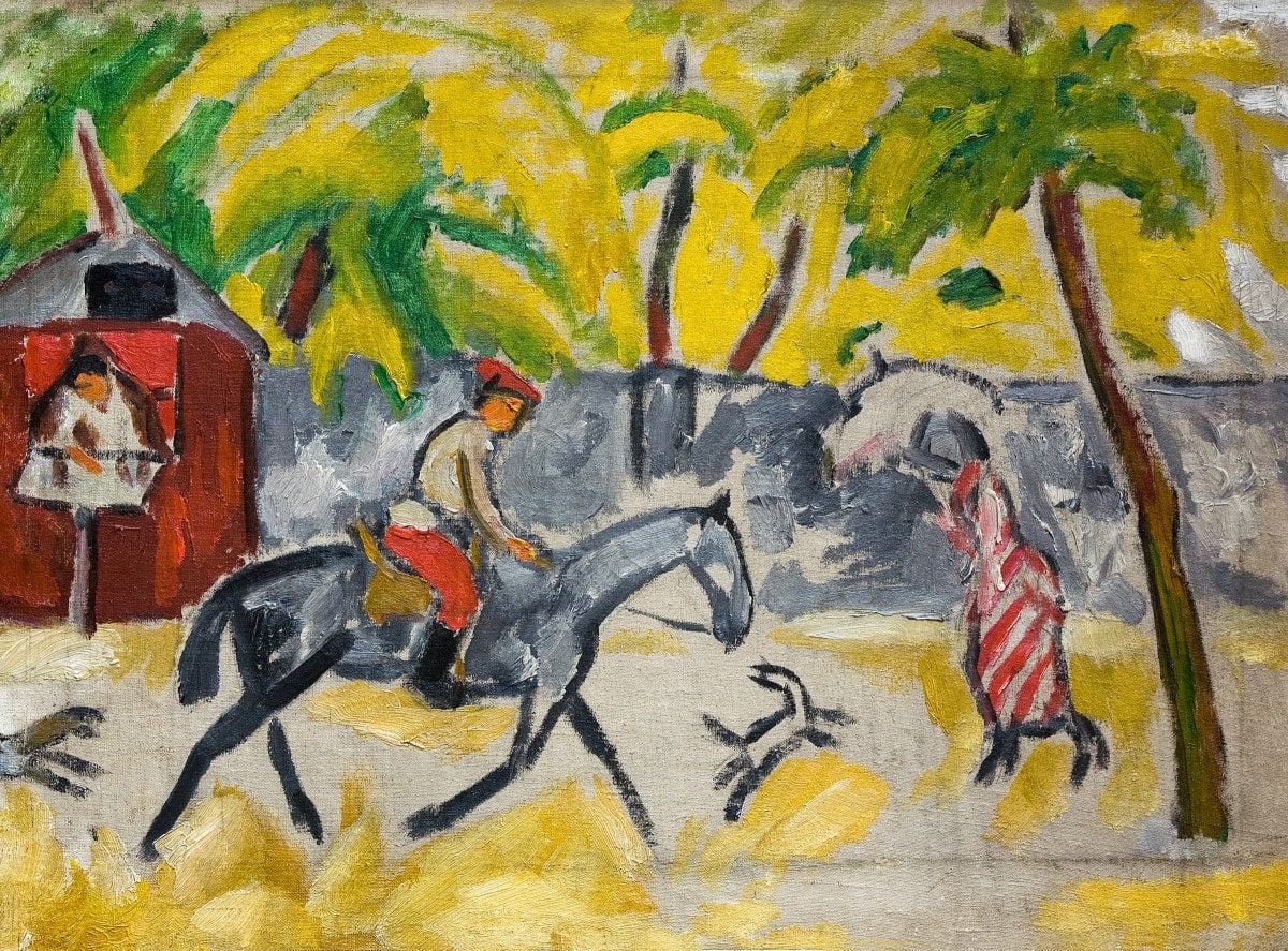 Оригинальный размер картины 48х65 см. Будучи увеличенными во много раз, фигуры наездника, дамы с зонтиком и лавочника почти теряют реалистичные очертания, и картина воспринимается почти как абстрактное полотно, красочное и мощное в своей выразительности.