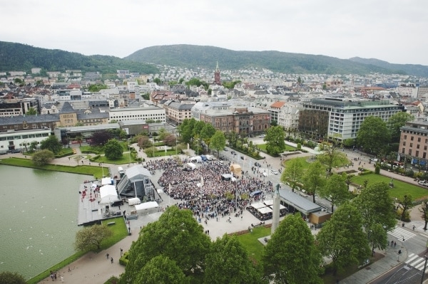 Уже в 62- раз в конце мая спокойный и дождливый Берген (дожди здесь идут более 300 дней в году) превращается в модный и оживленный центр искусств. Фестиваль охватывают весь город — на площадях разворачивается программа уличных представлений, игр, танцевальных состязаний, в концертных и театральных залах выступают мировые звезды, а фестивальную символику можно увидеть на каждом шагу — флаги, афиши, билборды. Даже багажная лента в аэропорту Бергена представляет собой дизайнерское решение: получая багаж, гость любуется инсталляцией копий музыкальных инструментов.