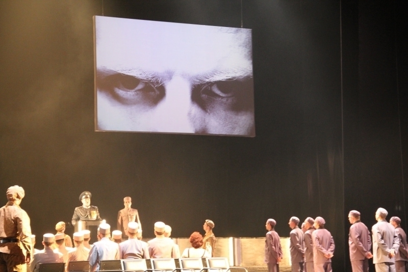 Кроме того, на сцене был большой экран, с которого на происходящее взирал «Большой брат», а на экранах поменьше высвечивали слова – «смерть» и «ненависть».