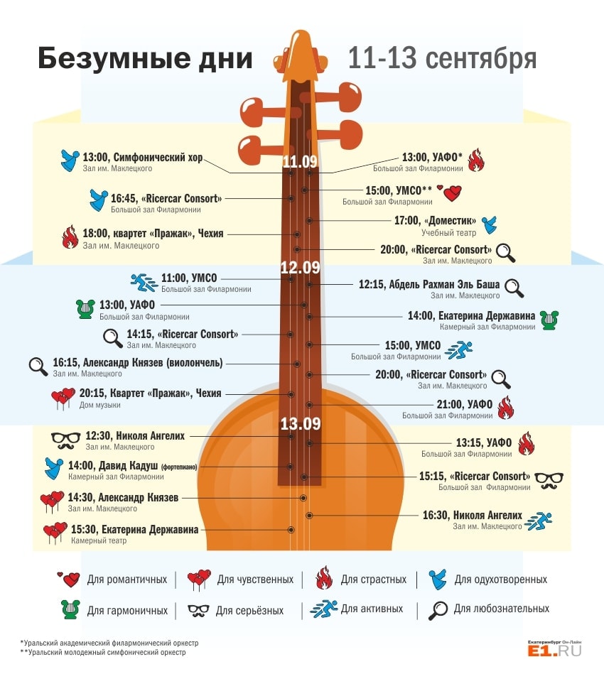 Программа всех 70 концертов с участием музыкантов из России, Германии, США, Франции, Бельгии, Чехии, Швеции, Испании размещена на сайте филармонии. У фестиваля есть ещё одно место действия — Музей истории Екатеринбурга (ул. К. Либкнехта, 26), где будут проходить встречи с музыкантами. А первым на творческую встречу 10 сентября в музей отправился Рене Мартен, «отец» прекрасного музыкального «Безумия».