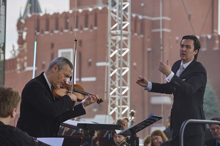В этот же раз на огромном экране на фоне исторической Спасской башни Кремля камера транслировала все действия дирижёра Дениса Власенко в момент его вдохновенной работы с оркестром, замечательным солистом, с великой музыкой. И это было не просто чёткое изображение, а это была дополнительная информация о содержании произведения, об отношении дирижёра к исполняемой музыке.