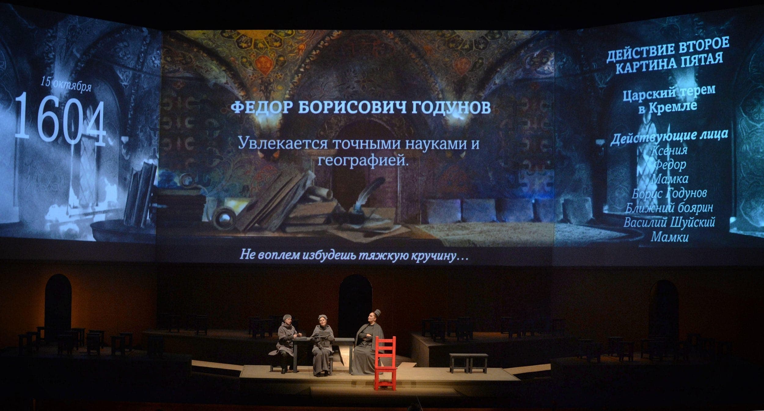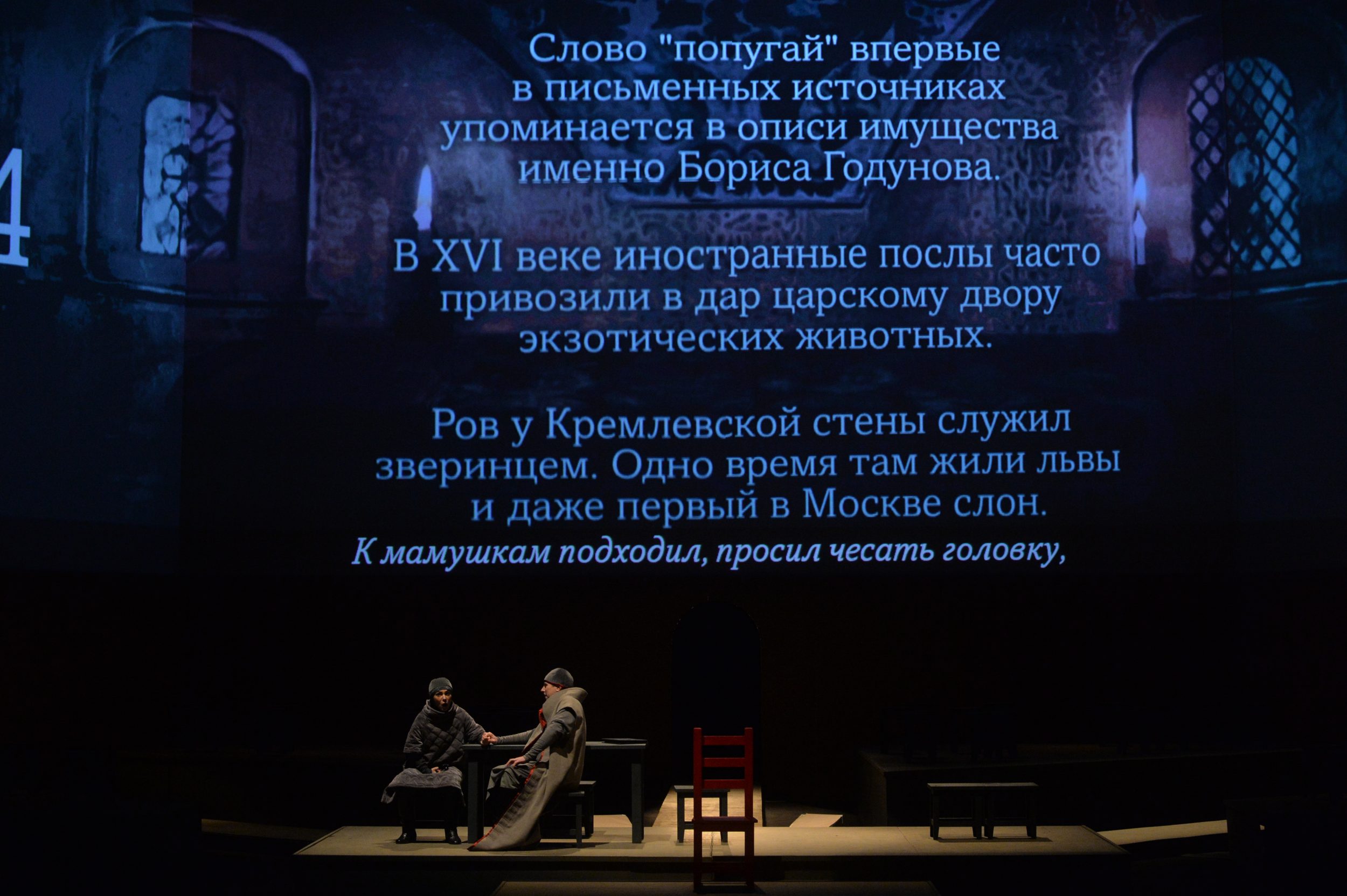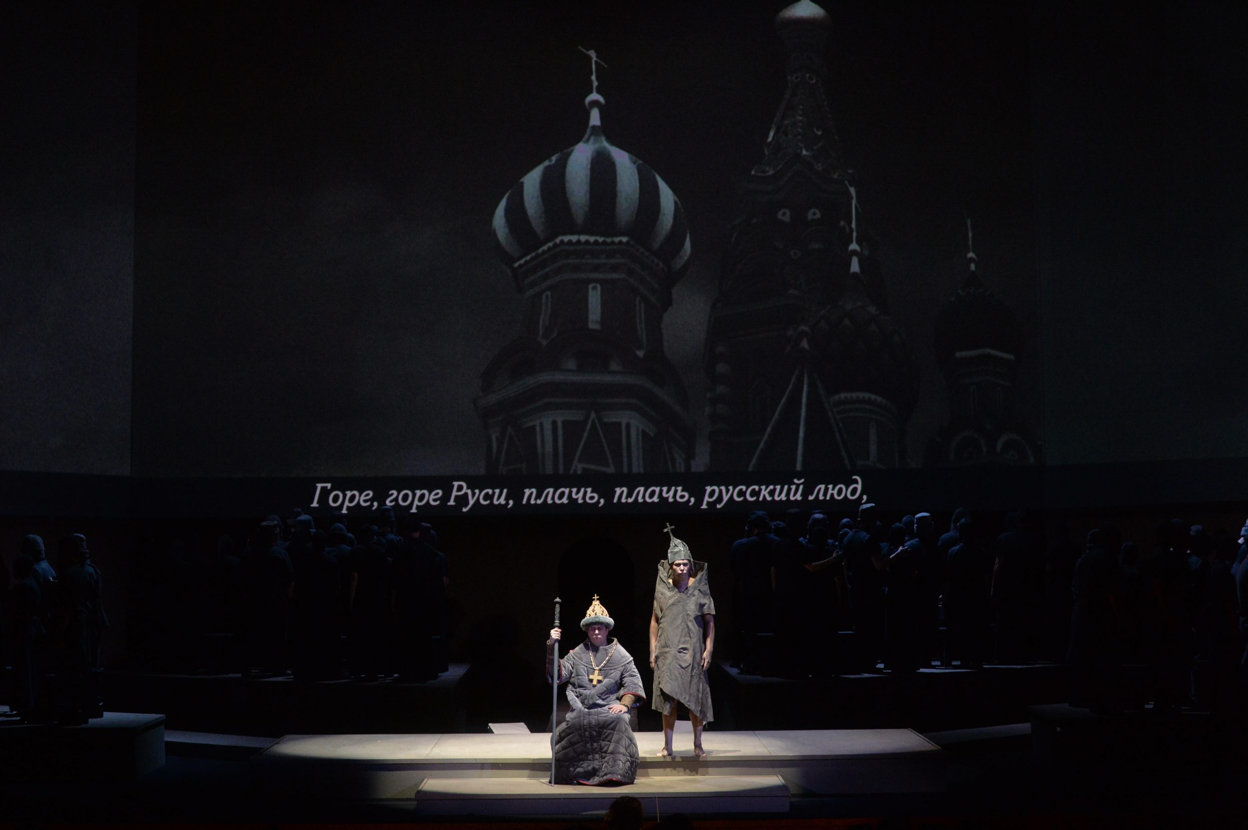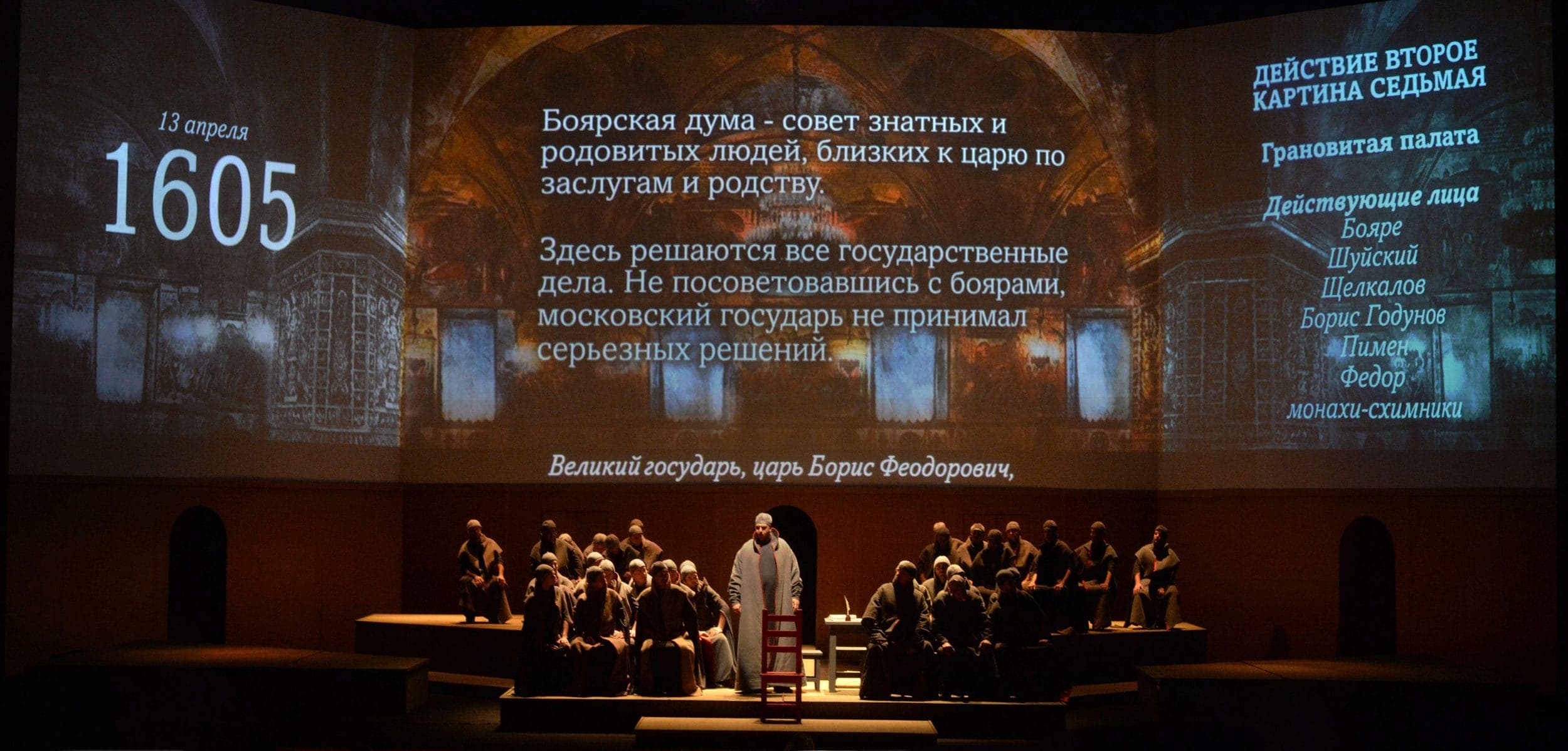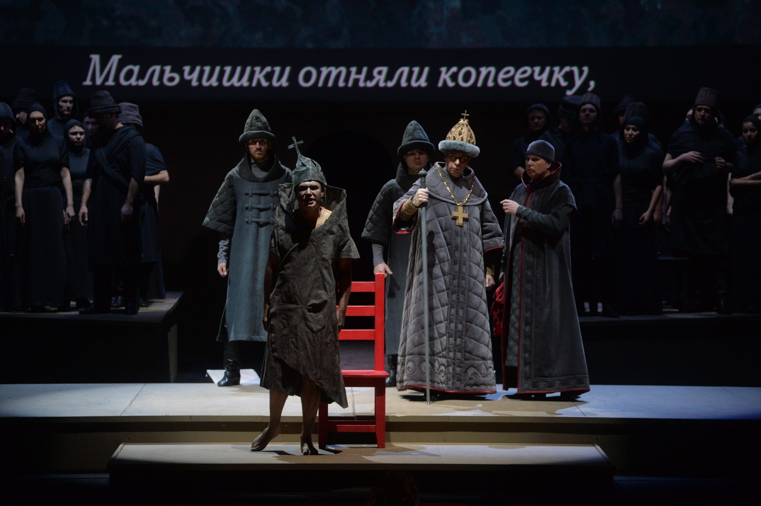 С первых минут становится понятно, что создатели спектакля хотят вернуть опере Мусоргского тот исторический фон, старинный флер, который сегодня исчезает за нашим ходульным отношением к персонажам любой оперы. К тому же еще и текст Мусоргского, вобравший строки Пушкина и Кармзина и проецируемый на экран, не только дает возможность понять, что поют артисты, но также становится полноправным действующим лицом. И Дмитрию Белову в этой ситуации удается изменить отношение зала к происходящему на сцене.