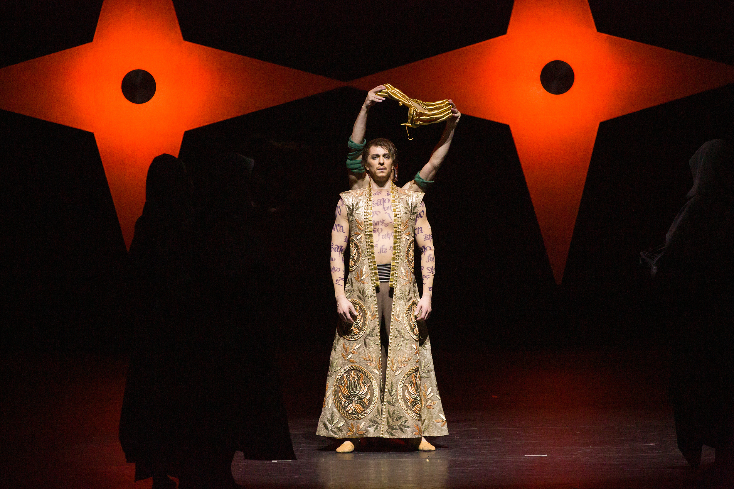 Спектакль открывается мужским моряцким хором, озвучивающим мысли главного героя. Вскоре его сменит хоровод духов на острове. Но всё внимание — на Просперо в исполнении Дениса Савина, одетого в развевающийся фиолетовый балахон.