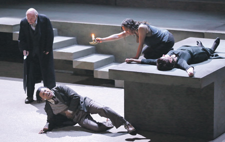 Херлициус здесь – эдакая волоокая брутальная пацанка в штанах и майке, бросающая арку из глубины мифа фактически в наше время, равно как и Клитемнестра с элегантной короткой стрижкой. Вальтрауд Майер выбегает на оперную сцену по кроваво-красной дорожке, словно с одной из олигархических тусовок. К слову, она была Изольдой в предыдущей работе Шеро – «Тристане и Изольде», и чувствовалось, как близок и родственен ей стиль этого режиссера.