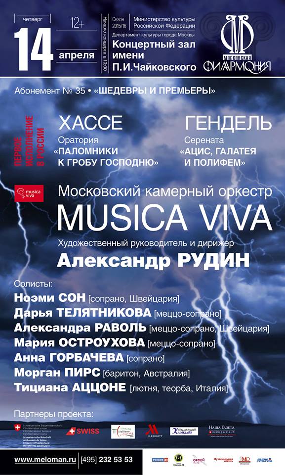 На этот раз в рамках популярного абонемента впервые в России были исполнены два шедевра барочной музыки — опера-кантата «Ацис, Галатея и Полифем» любимого публикой Генделя и оратория «Паломники ко Гробу Господню» малоизвестного российским меломанам Хассе.