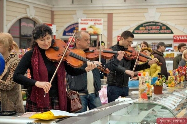 «Сначала среди тишины стало немного слышно виолончель, я даже подумала, что мне показалось. А потом посреди торгового зала я увидела Хобарта Эрла, стоящие неподалеку женщины начали доставать скрипки и уже через пару мгновений на весь «Привоз» зазвучала симфония.