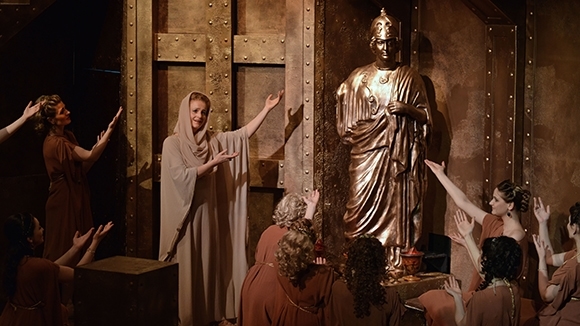 Режиссер Ольга Иванова решила оперу в реалистическом ключе. Аристократы щеголяют в вышитых тогах. Женские головки украшены венками. Странник картинно опирается на посох. Возлияния совершаются из близких к аутентичным чаш. Предусмотренная либретто оргия разворачивается во всех подробностях. Балета в театре нет, поэтому за дело берутся солистки и хористки. Девы ублажают патрициев столь темпераментно, что стеснительные зрители опускают глаза.