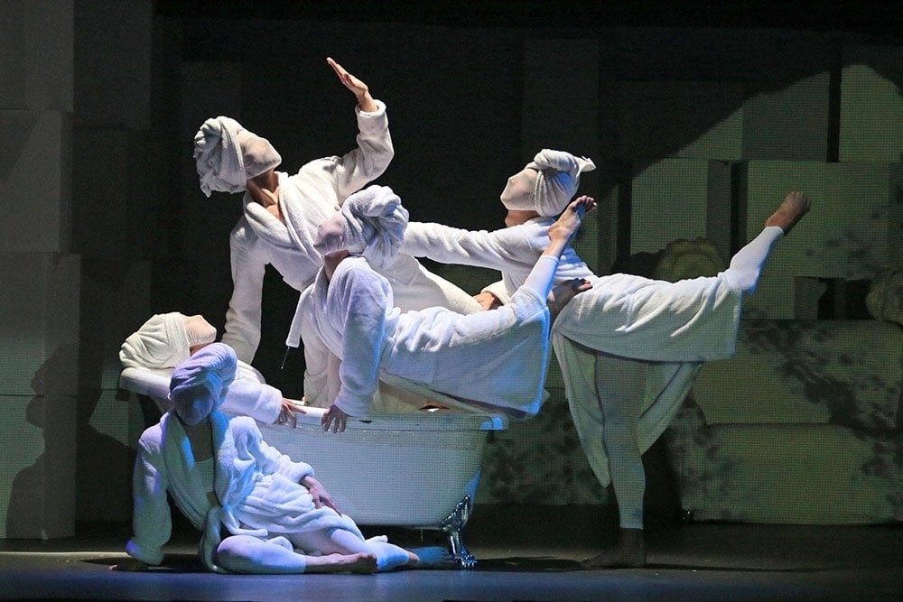 В этом спектакле заняты пять танцовщиц и семь актрис, объединенные общей пластической задачей, которую поставил хореограф Александр Фролов. Он же исполнил главную роль Эдвина, и его работа — и исполнительская, и хореографическая — ярчайшая удача спектакля.