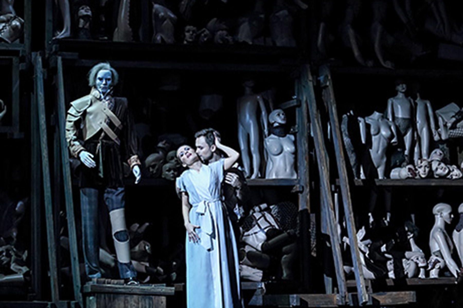 Центральный образ спектакля, придуманного аргентинкой Валентиной Карраско, — это Страшный суд: гигантский стеллаж размером во весь задник сцены забит манекенами. Метафора работает и на поглотившую Моцарта «могилу для бедняков», и на чеховские «скелеты в шкафу».