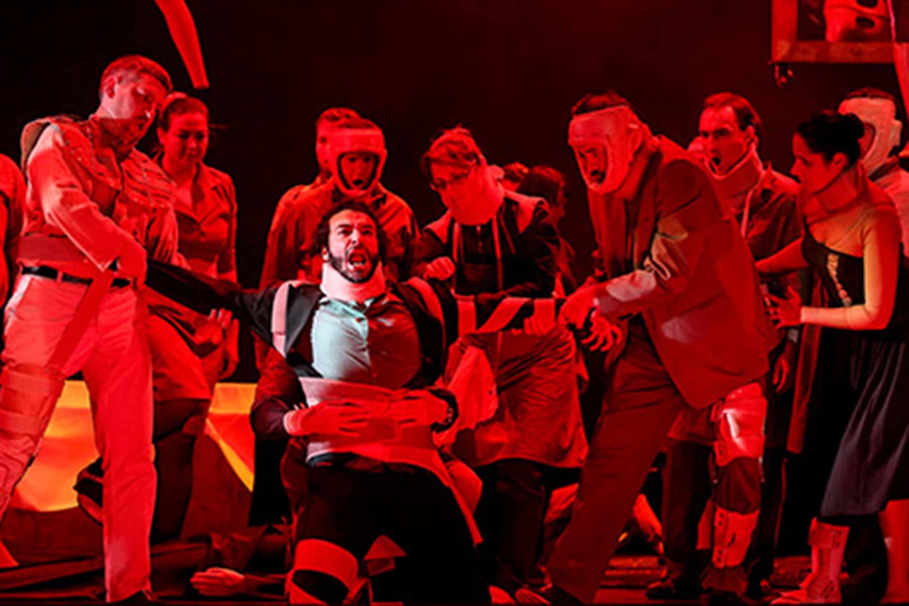 За корсетами, бандажами, ошейниками, наголовниками — намек на полную выключенность того, что в нормальных людях подразумевает свободу движений ума, души и сердца. Постановка об этом. И вся она — один большой флешбэк между грохнувшимся в увертюре из-под колосников «трупом» Дон Жуана и финальным растерзанием героя в лучах адского пламени.