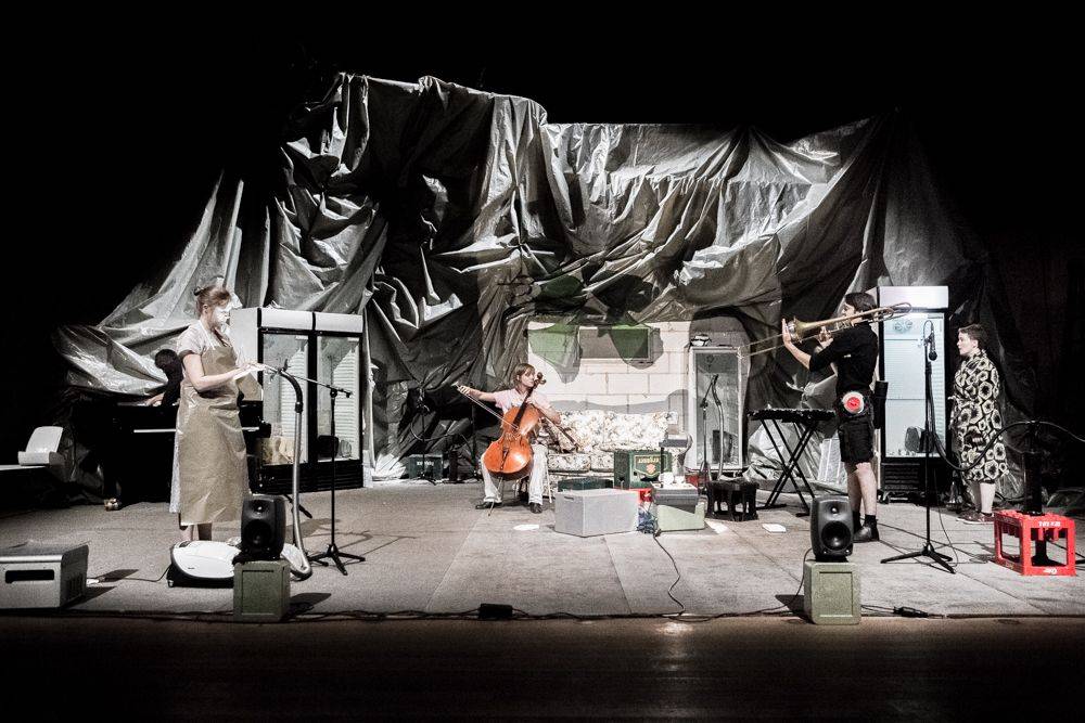 На сцене — стол со стаканами. Сидящая за ним девушка наклоняется к посуде, и мы слышим странные звуки — то ли тихое пение, то ли эхо. Постепенно появляются остальные участники ансамбля. В их руках бутылки с микрофонами будут звучать как терменвоксы, а обычные пылесосы — как тубы и тромбоны. К этому можно прибавить звон разбитого стекла, постукивание по микрофону и гул насосов. Все шумы соотнесены друг с другом по высоте и преображены электроникой таким образом, чтобы скрытая в них музыкальная составляющая выходила на первый план.