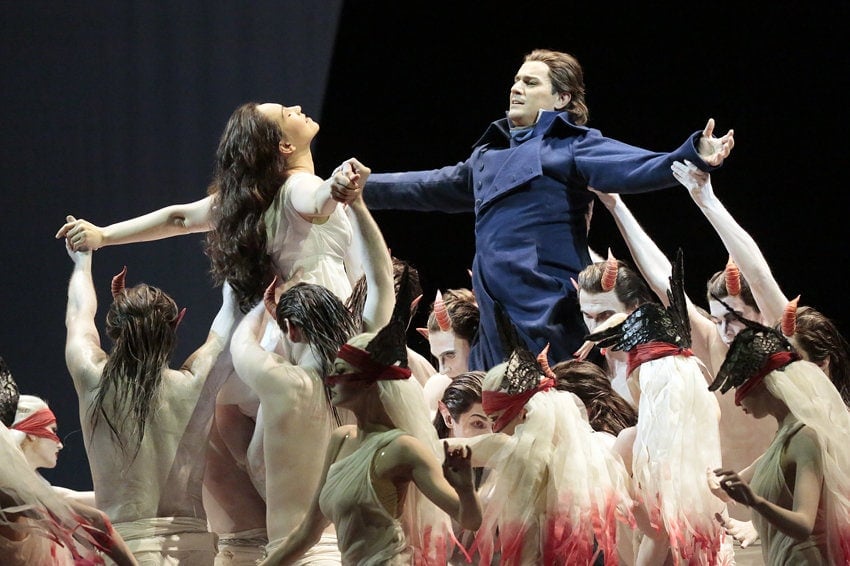Но картинка спектакля (сценограф Фердинанд Вёгербауэр, художник по свету Иоахим Барт) по-сказочному красивая и наивная. Если Долина роз, то на сцене распускаются гигантские цветы. Если скачка над бездной, то Фауст и Мефистофель перемещаются в пространстве по воздуху, забираясь на лошадей, похожих на корзину воздушного шара. А в сцене Ада «земная твердь» внезапно раскалывается, и Мефистофель препровождает Фауста в преисподнюю, Маргарита же на глазах у зрителей буквально возносится под колосники, то есть в Рай.