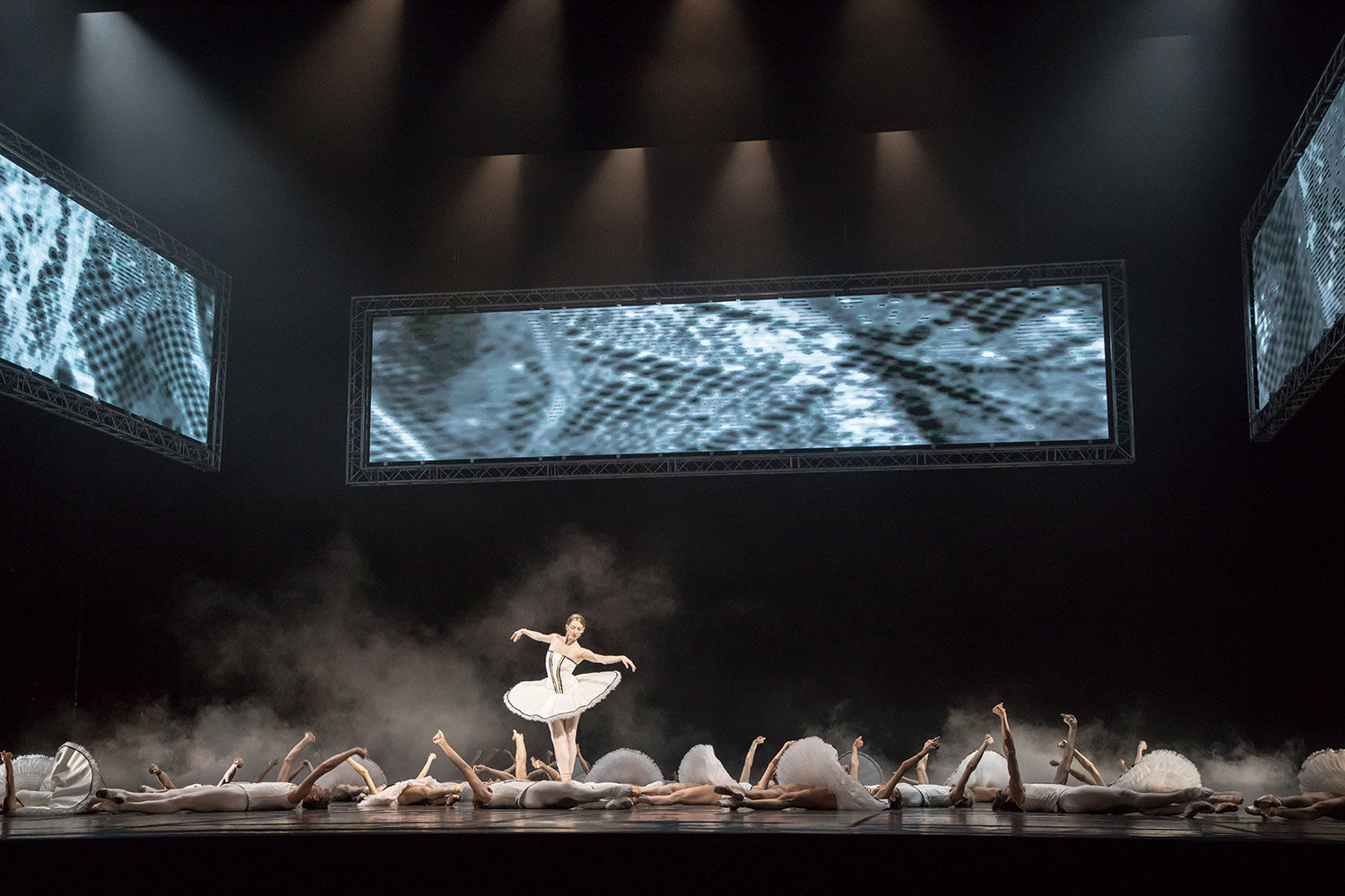 В гротескном спектакле, соединяющем утробное мычание «лебединой» темы Чайковского и запинающиеся речи танцовщиц, рассказывающих о своей работе, экраны в качестве декораций, титры над сценой и танец в оркестровой яме, разнородность труппы, только нарабатывающей единство ансамбля, выглядит совершенно уместно, а масса солистов упивается своими небольшими, зато эффектными ролями.