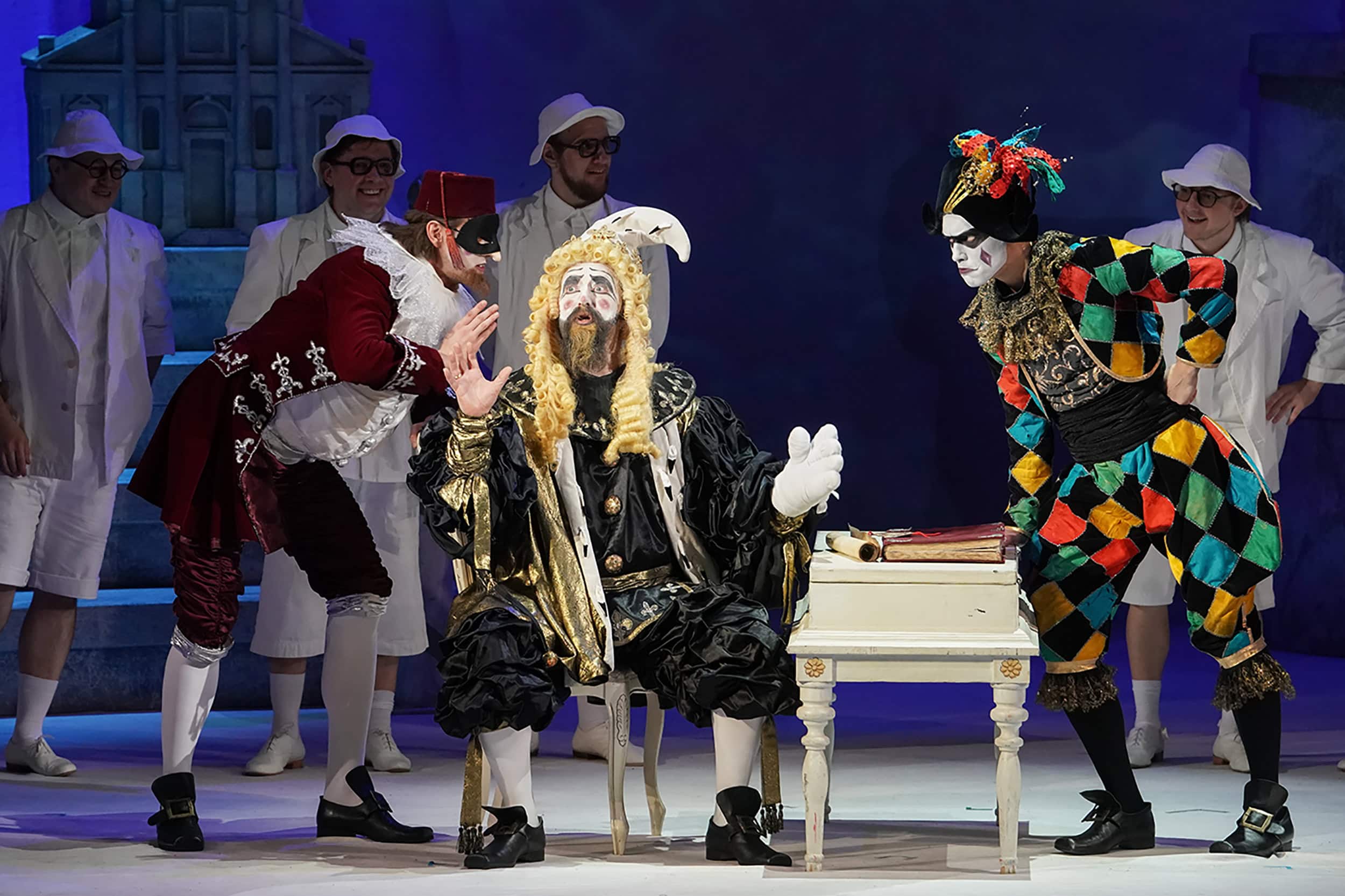 Венецианские маски-бауты, механическая бегающая крыса, скелет с косой как знак ипохондрии, король с окладистой русской бородой, но в европейском парике, Труффальдино в традиционных пестрых «заплатках», внимательно ловящий рыбу в ведре. Принц как грустный и капризный Пьеро, градусник с человеческий рост, виртуальные мыльные пузыри на заднике, нарочитые фижмы Клариче и единорог как лошадь, свита Фаты Морганы как пародия на свиту Феи Карабос из «Спящей красавицы», фокус с «разрезанием» тела в ящике.