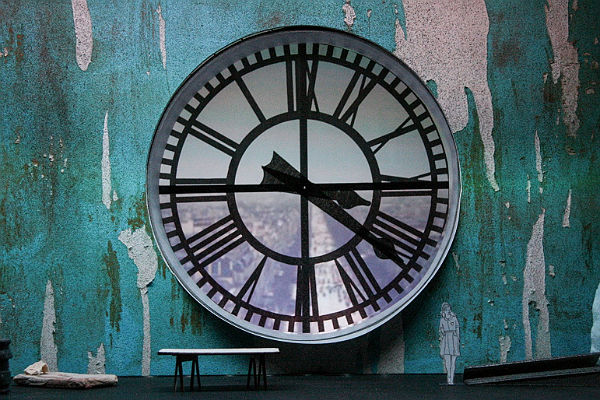 На этом фоне меркнут даже те постановочные идеи, которые в принципе могли бы интересно работать – например, антифонно построенные мизансцены второго действия. Или придуманный сценографом лейтмотив круга времени: огромное окно-циферблат с видом на Париж в первом действии, створ Эйфелевой башни во втором, спиральный провал лестничной шахты в третьем, круг неба в четвертом.