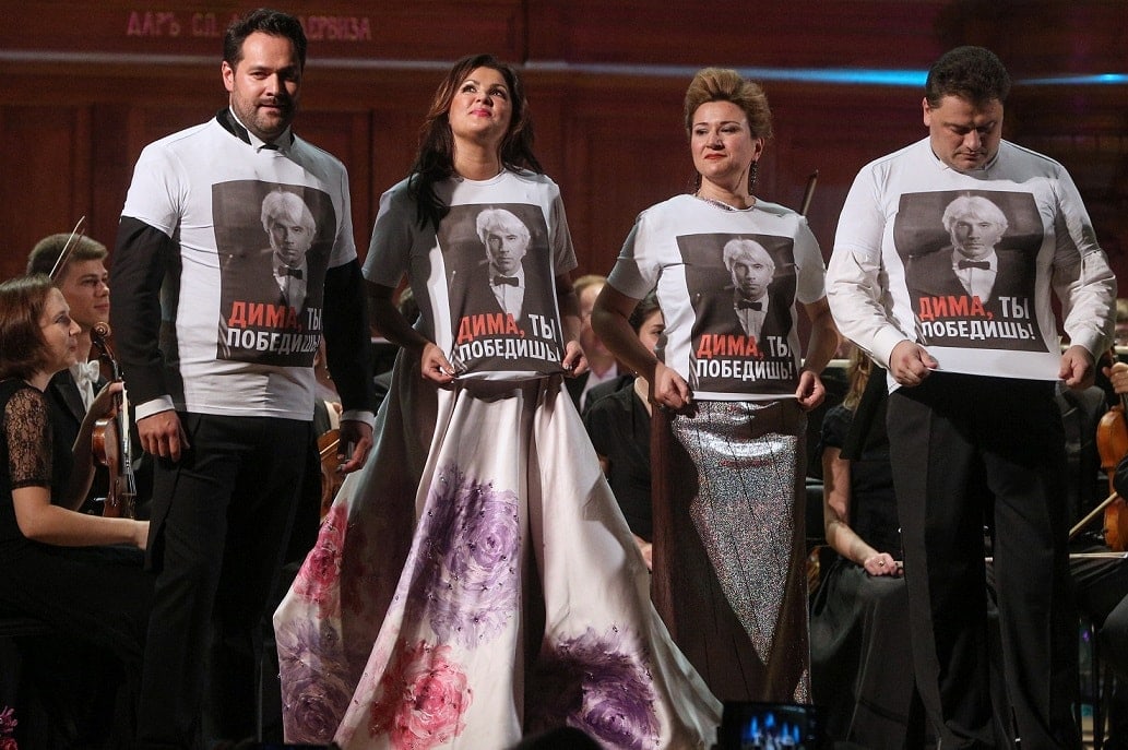 По окончании всех бисов солисты и дирижёр вышли на сцену в белых футболках с портретом Дмитрия Хворостовского с надписью «Дима, ты победишь!» и запели «Очи чёрные»!