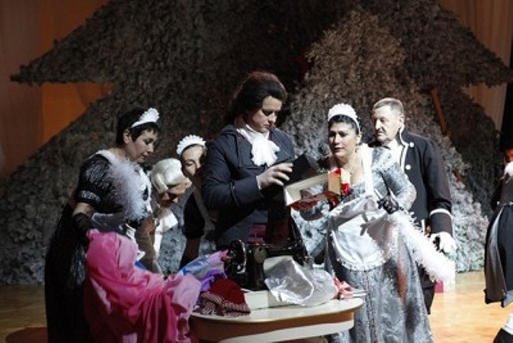 В этой постановке все перевернуто с ног на голову. Зрители сидят на сцене (словно наблюдая за домашним спектаклем в роли гостей), артисты разыгрывают действие в зрительном зале. Оркестр размещен за огромной елью, расположенной по центру зала. Да, она настолько большая, что в ее ветвях может укрыться целый оркестр, включая дирижера Евгения Хохлова.