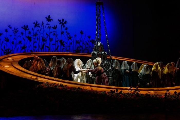 Есть ещё один крайне важный элемент сценографии, её центр, её средоточие. Мы видим его сразу, но не сразу понимаем, что же находится посреди круга — резное, серебристомерцающее? Почему Иоланта, пытаясь справиться с волнением, припадает к этому, как русская девушка припадает к берёзе, прося у неё сил?