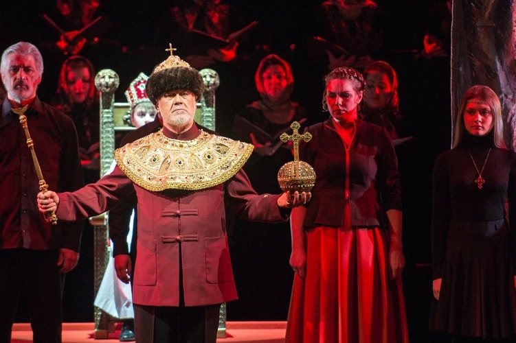 Такова предыстория проекта под названием «Царь Борис», состоявшегося в начале января в Михайловском театре. Мрачноватым лаконичным мизансценированием в духе 80-х годов прошлого века занимался Виталий Фиалковский, уже работавший на этой сцене с Юровским над «Мастером и Маргаритой» Слонимского.