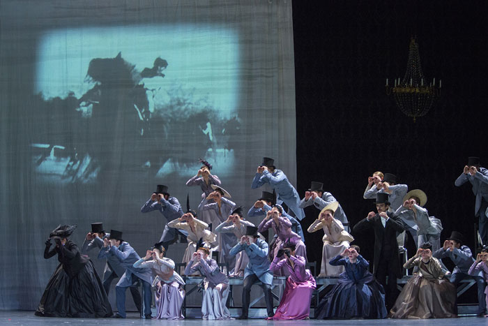 На сцене конец эпохи Александра II, о которой писал Толстой (роман был злободневным, не то что сейчас – с превращение разводов в тривиальность), эпоху представляют стилизованные женские турнюры из тяжелых бытовых тканей. Ну и что, что видны пятна от пота? — артистам физически трудно и неудобно танцевать в тяжелых драпировках, зато это красиво и исторически достоверно, именно красивая одежда (сценография условна и бедна) делают картинку балета привлекательной для зрителя.