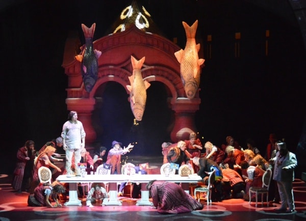 Но похоже, наиболее притягательным для режиссера было обстоятельство третье: происходящее в подводном царстве. Ведь сцена «Геликона» оснащена по последнему слову техники. Представьте, как Садко с гребцами на корабле вдруг медленно уходит «под воду», а снизу поднимается мерцающий мир морской. Хореографу Эдвальду Смирнову достало юмора сочинить уморительный танец рыб-бояр.