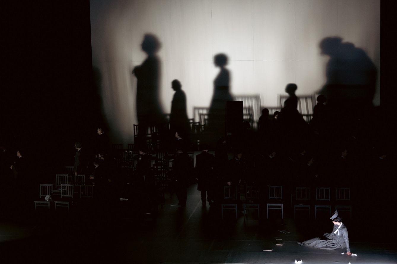 Впрочем, опасения оправдались лишь наполовину. В первом акте режиссёрша (или как там сейчас правильно) в самом деле не придумала ничего. Певцы просто не понимают, что им делать кроме пения, и на протяжении почти всего действия только поют, стоя около рампы и не отрывая взгляд от дирижёра. То же касается хора: вышли, встали/сели, спели, ушли. Только в самом конце главный герой яростно подбрасывает вверх молитвенники — единственная внятная мизансцена за целый час. Другой вопрос — уместная ли.