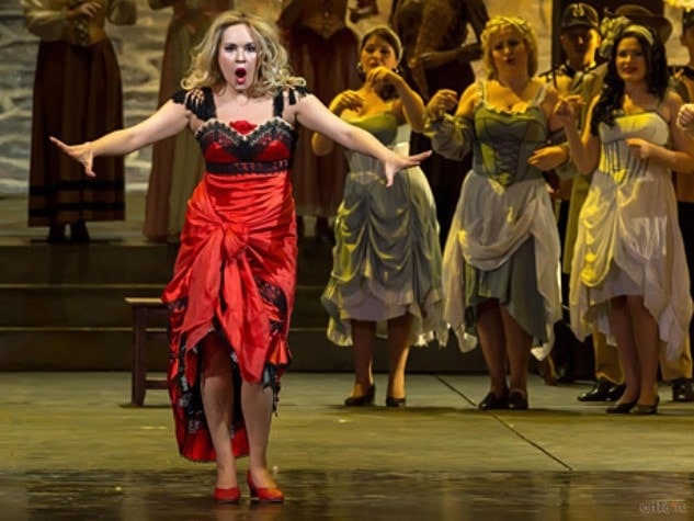 Даже незнакомым с привычной продукцией Георгия Ковтуна что-то в представленной накануне «Кармен» покажется не из «этой оперы». Почему на героине, выбежавшей на улицу с табачной фабрики с подругами, не белая нательная рубашка, как у них, а красное платье?